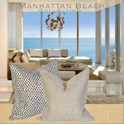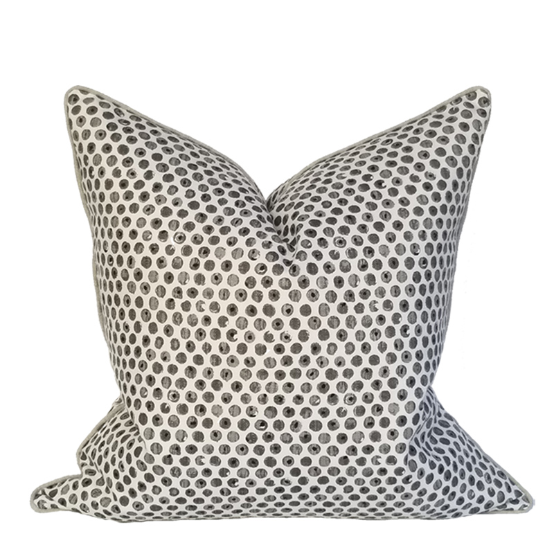 Manhattan Beach Collection’s Black Pearl Pillow features a multi tonal colored poka-dot pattern in a woven cotton slub. Wonderful transitional contemporary offering visual interest in both scale and texture… Great for adding a little”drama” to your room! Reverses to same with contrast cord detail. Our own premium feather/down insert with invisible zipper closure. Choose 14×20, 16×24 lumbars, 20, 22, 24″ squares or swatch. Made to order, ships 2-3 weeks. Shown: 22″