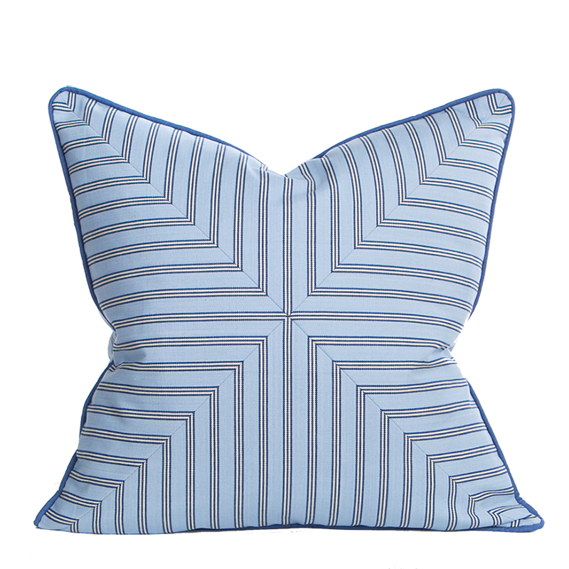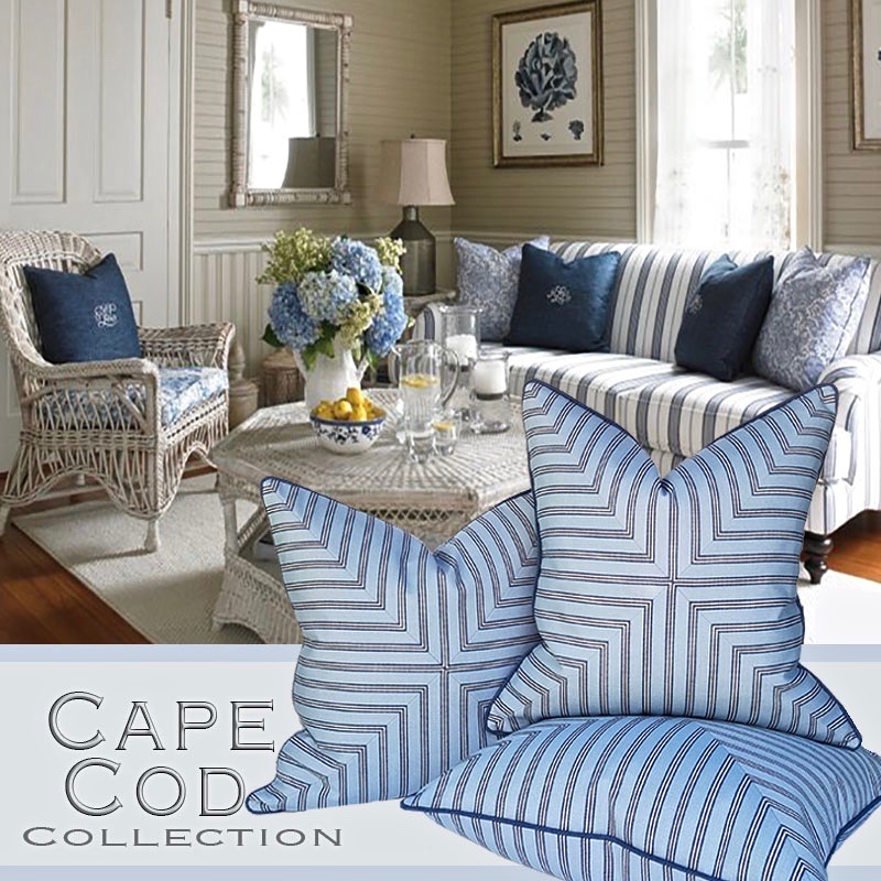 The Chatham Pillow from the Cape Cod Collection features a sky blue striped fabric fabricated into a cross panel cut design. Unique styling focal point pillow for any room!